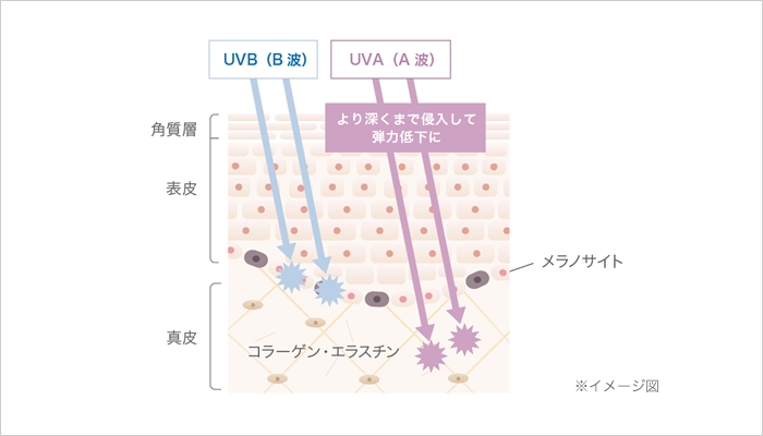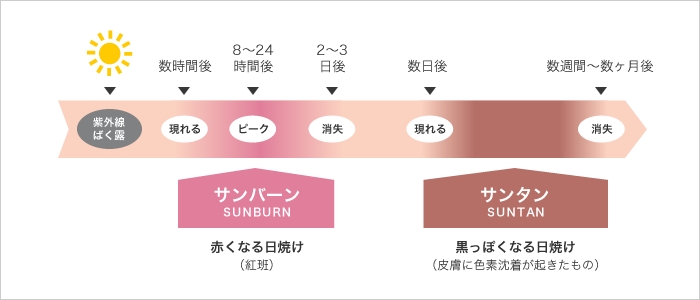 「サンバーン」は紫外線を浴びた数時間後から現れる赤い日焼け(紅斑)のこと。「サンタン」は、赤い日焼けが消失した数日後に現れ、数週間から数ヵ月続く黒い日焼けのことです。 -