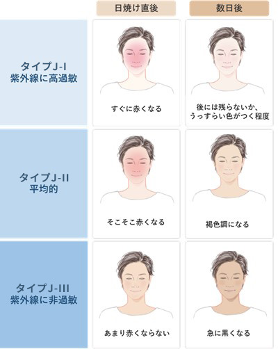 日焼けの仕方によって肌タイプが分けられます。図のように、「タイプJ-Ⅰ(紫外線に高過敏)」の人ほどサンバーンが強く、「タイプJ-Ⅲ(紫外線に非過敏)」の人ほどサンタンが強く表れます。日本人の平均的なスキンタイプはJ-Ⅱのようですが、あなたはどの肌タイプですか?